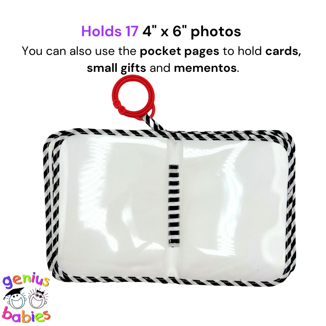 - Newborns see black and white most clearly which is why we designed this my first photo book with those colors. Black and white patterns will help your Genius Baby learn visual focus.