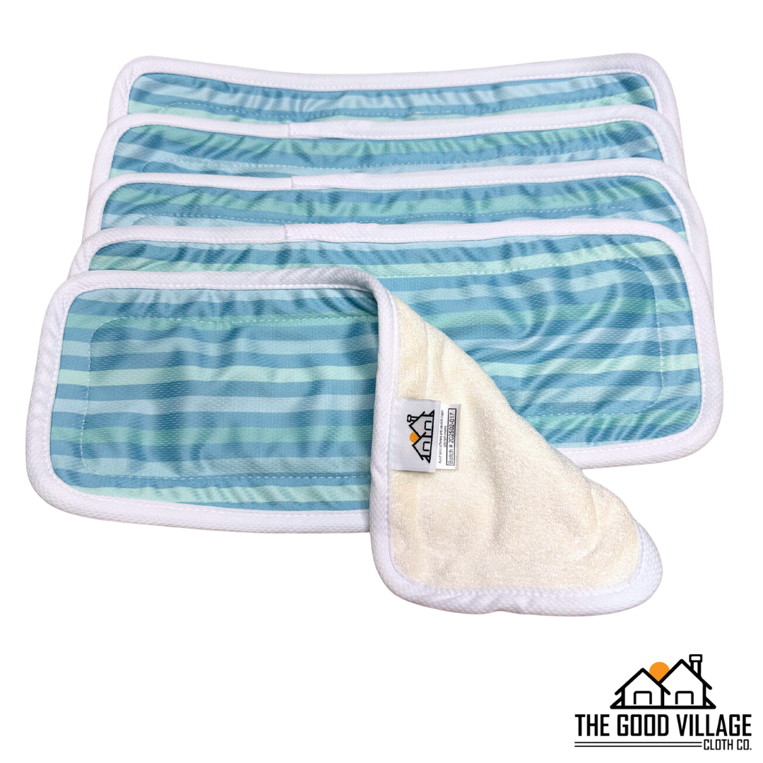 Our 5 Pack of Bamboo Boosters with printed Athletic Wicking Jersey on top are perfect to use as an absorbency booster or folded in half for a newborn. The soft bamboo helps to keep your baby comfortable, while the printed AWJ provides both fashion and functionality in one!