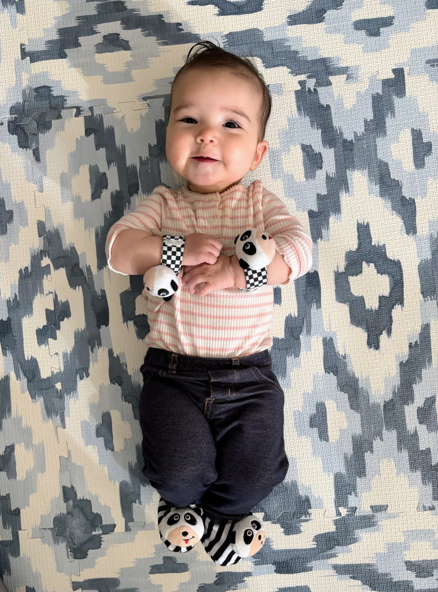 - Baby will delight in the rattle sound inside panda head with every kick and step