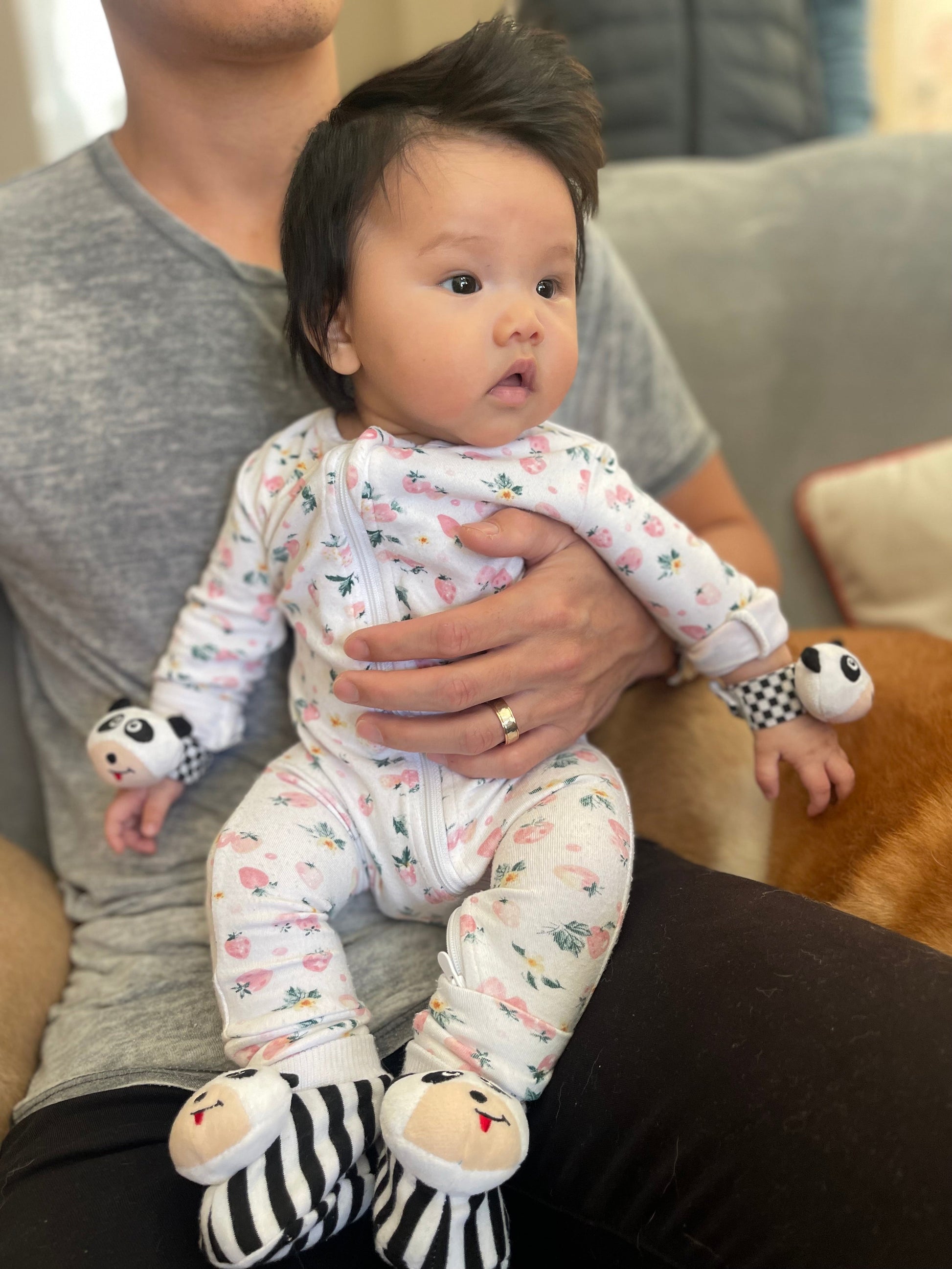 Details: Black & White Panda Baby Foot Rattles Toy - Infant stimulation foot rattles. Baby will delight in the rattle sound with every kick! Embroidered eyes - baby safe. Newborn and up. Genius Baby Toys has been providing quality developmental infant toys and educational baby toys since 1998.