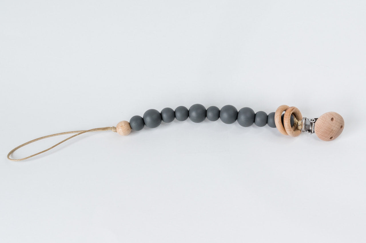 Charcoal Silicone Bead & Wood Ring Pacifier Clip