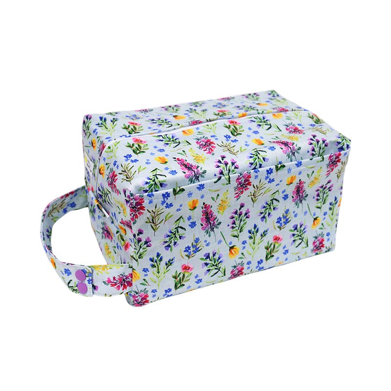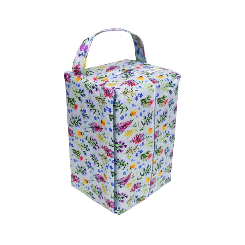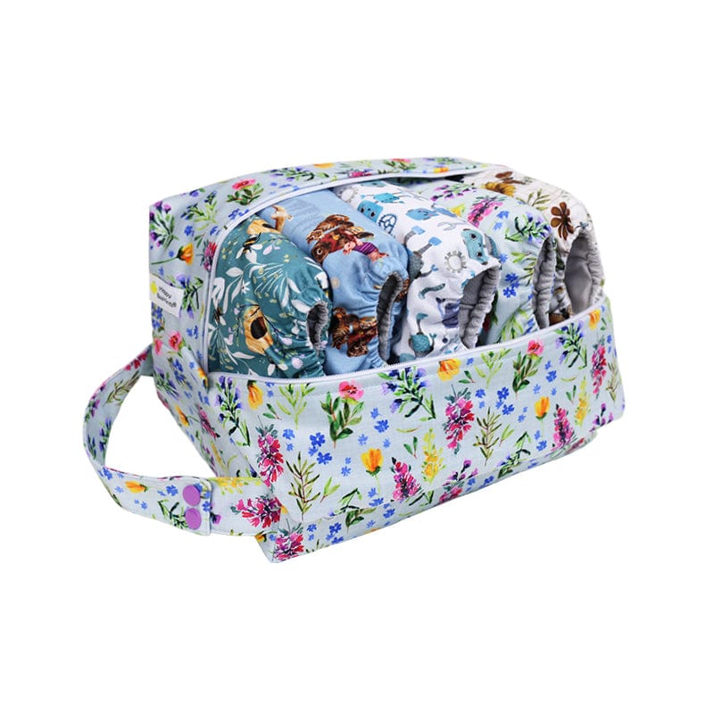Our diaper pods have two layers of PUL - solid white inside and a printed layer on the outside. There are loops on each side to attach a strap when needed plus a snap handle to carry with. A zipper at the top and a front zippered pocket.