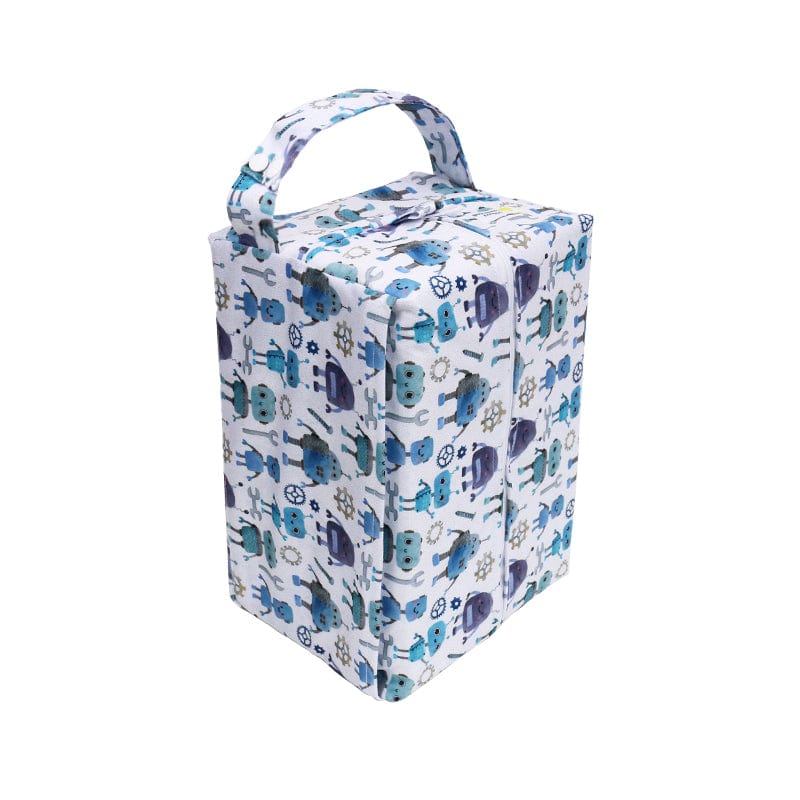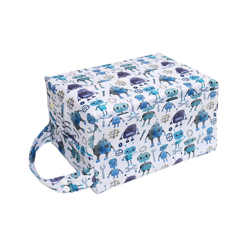Our diaper pods have two layers of PUL - solid white inside and a printed layer on the outside. There are loops on each side to attach a strap when needed plus a snap handle to carry with. A zipper at the top and a front zippered pocket.