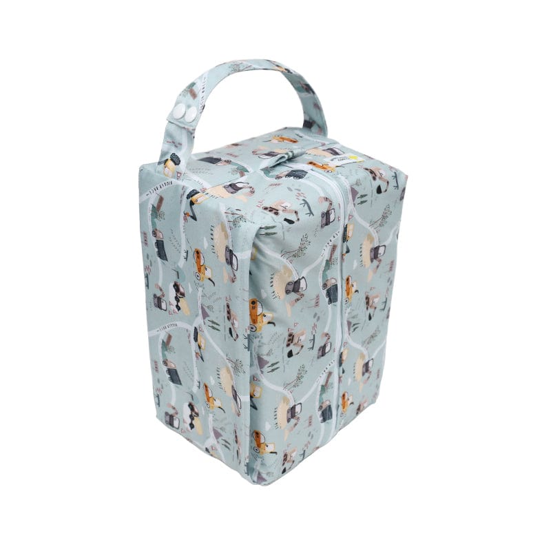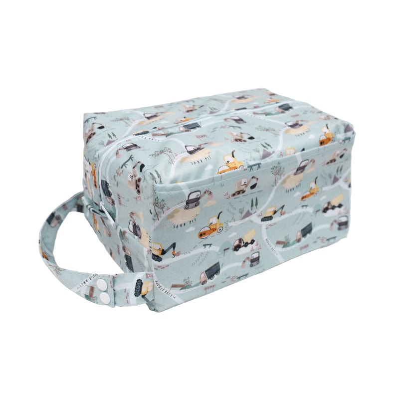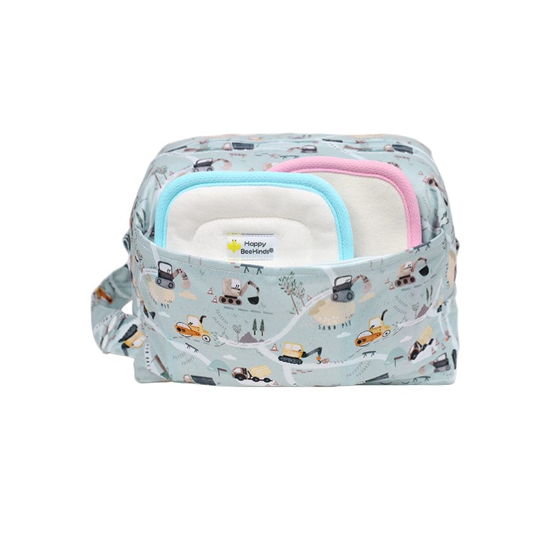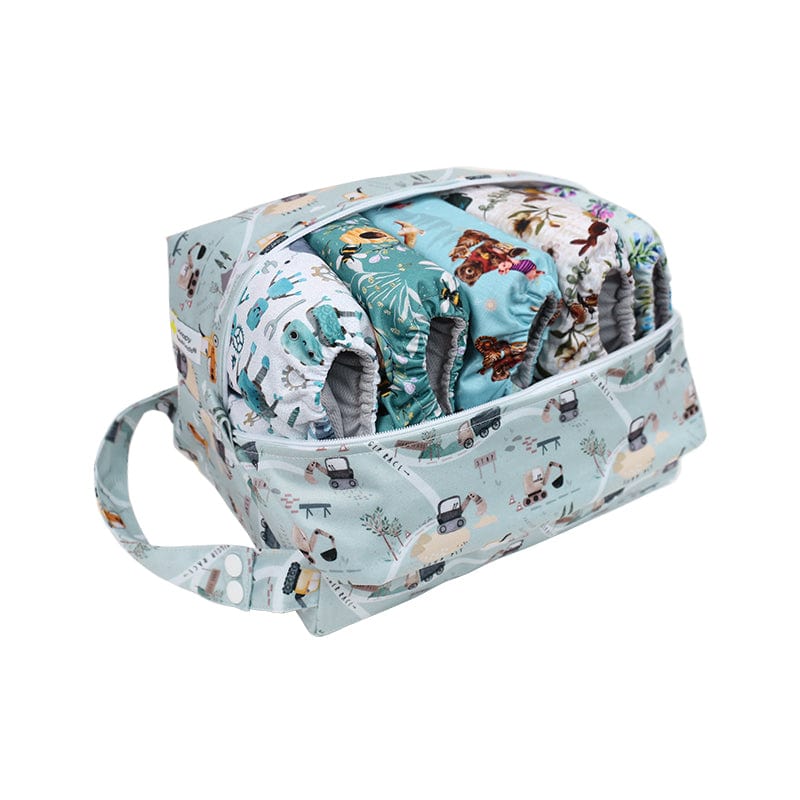 Our diaper pods have two layers of PUL - solid white inside and a printed layer on the outside. There are loops on each side to attach a strap when needed plus a snap handle to carry with. A zipper at the top and a front zippered pocket.