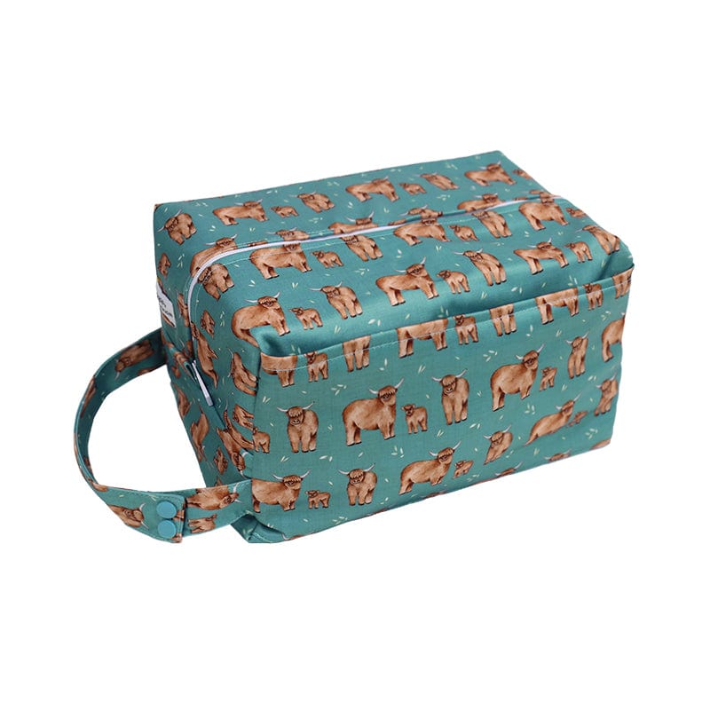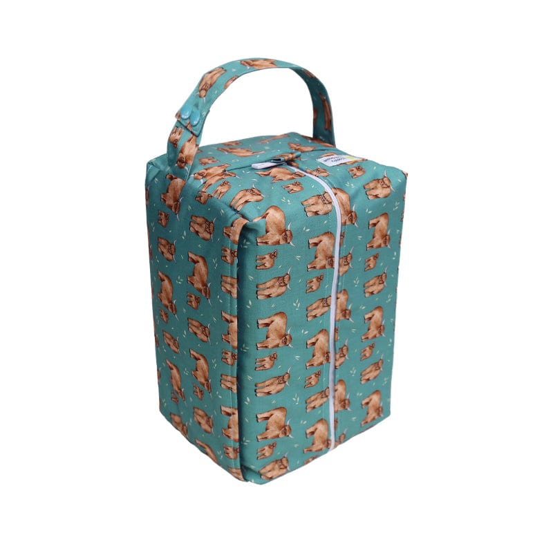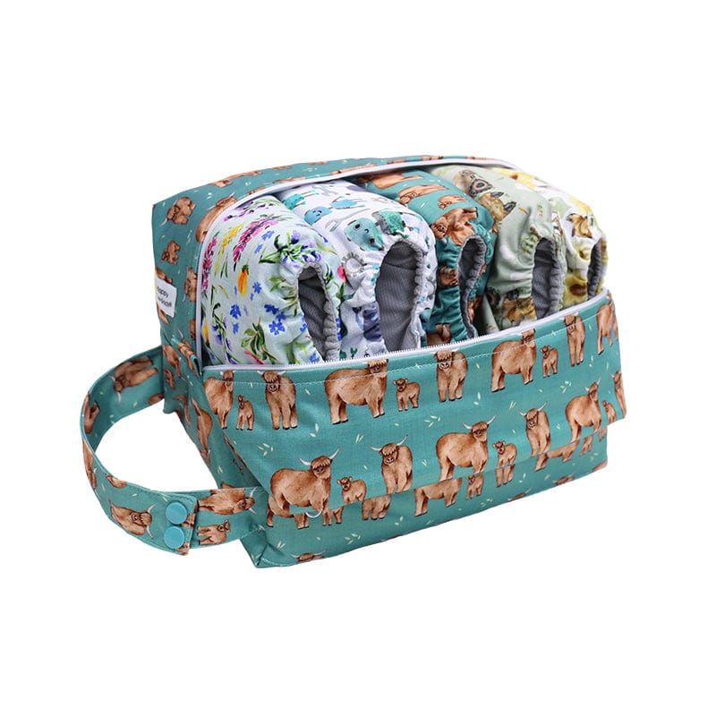 Our diaper pods have two layers of PUL - solid white inside and a printed layer on the outside. There are loops on each side to attach a strap when needed plus a snap handle to carry with. A zipper at the top and a front zippered pocket.