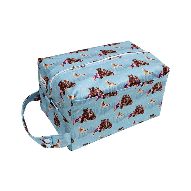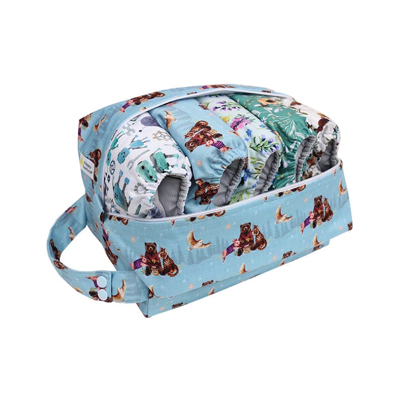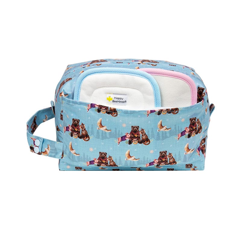Our diaper pods have two layers of PUL - solid white inside and a printed layer on the outside. There are loops on each side to attach a strap when needed plus a snap handle to carry with. A zipper at the top and a front zippered pocket.