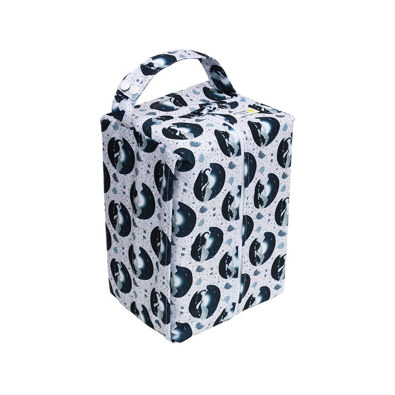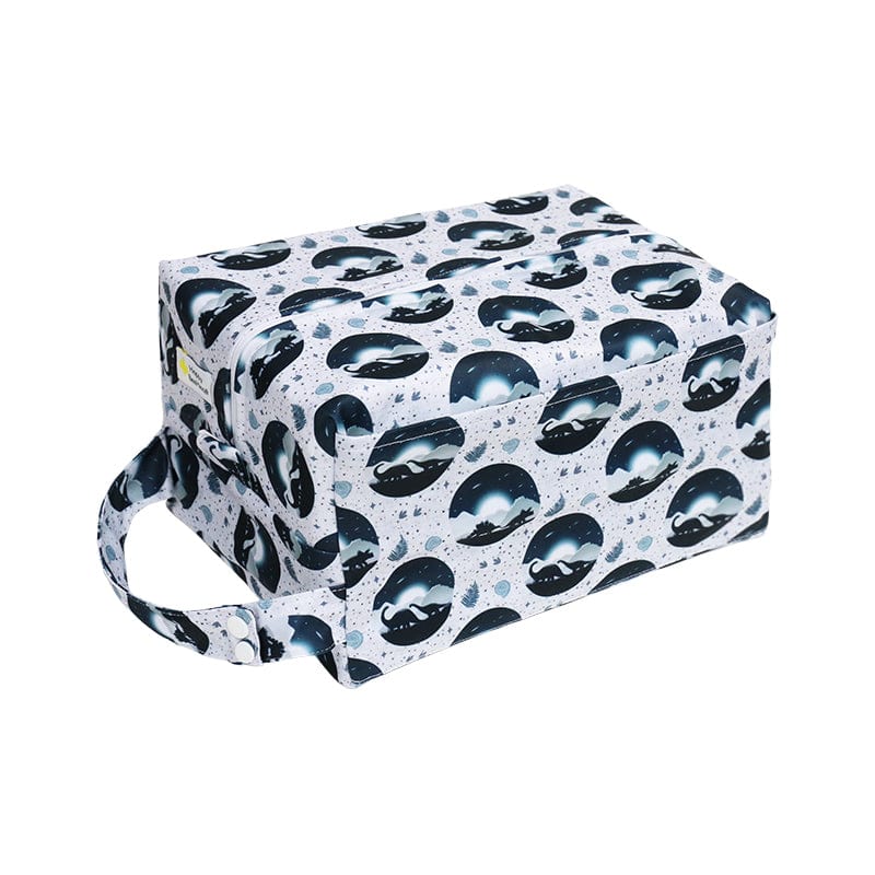 Our diaper pods have two layers of PUL - solid white inside and a printed layer on the outside. There are loops on each side to attach a strap when needed plus a snap handle to carry with. A zipper at the top and a front zippered pocket.