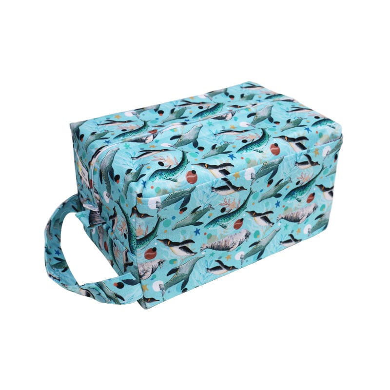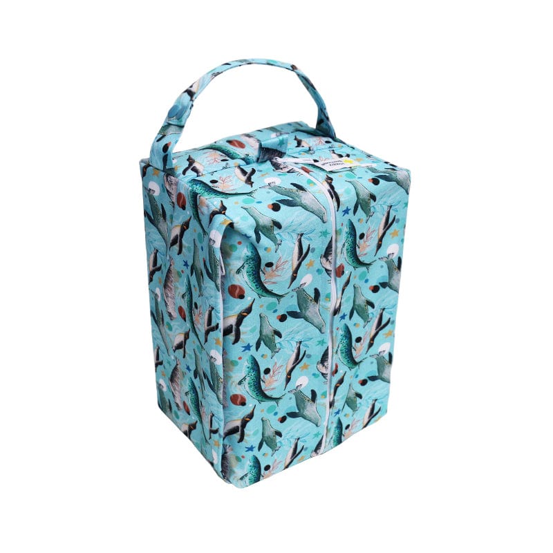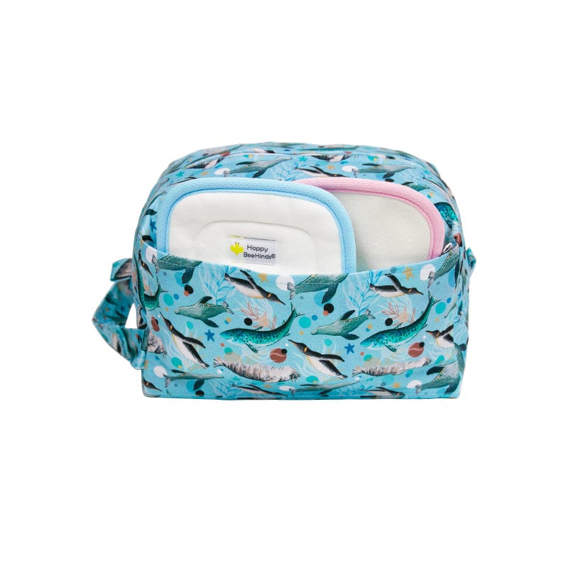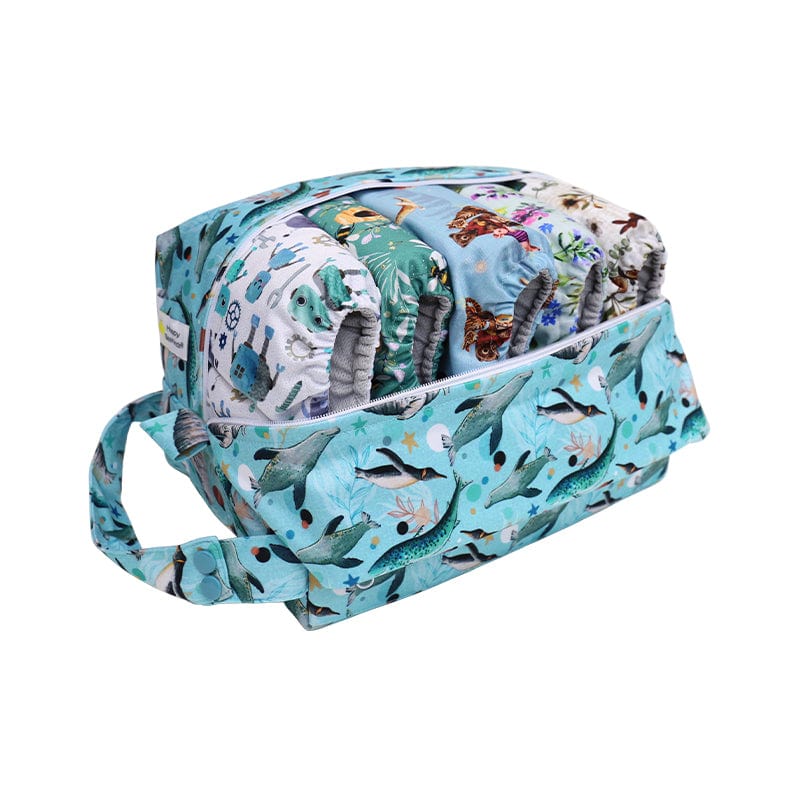 Our diaper pods have two layers of PUL - solid white inside and a printed layer on the outside. There are loops on each side to attach a strap when needed plus a snap handle to carry with. A zipper at the top and a front zippered pocket.