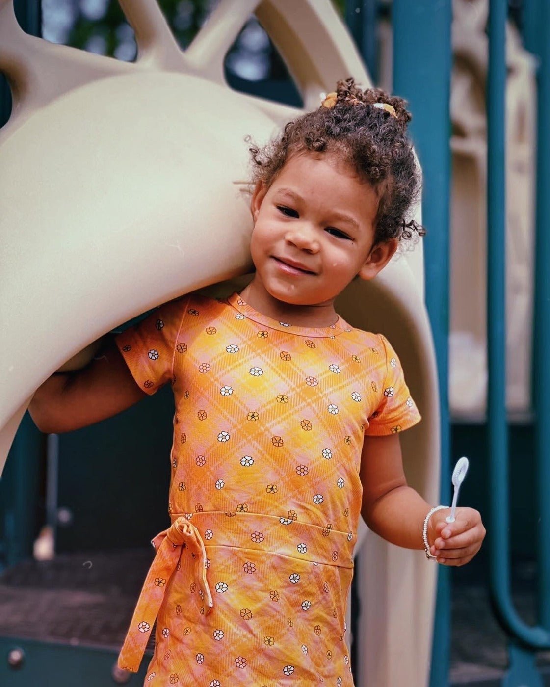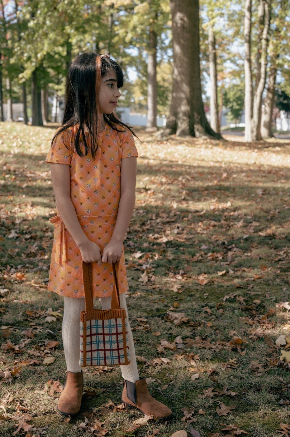 Your little one will be ready for a groovy season in this 60s inspired flower power plaid mod dress. Made from a cotton spandex fabric, your little one will be so comfy but stylish in this sophisticated silhouette. This mod dress features a faux tie at the waist and a zipper in the back. Sizes 6-12 Months, 12-18 Months, 18-24 Months include a matching diaper cover. So versatile, they can wear this dress in the fall, spring and even summer. For a groovy outfit, pair it with knee high socks in the spring for the cutest look, or warm knit tights and a sweater for fall. The golden plaid colors work perfectly for either season, or for fun in between!