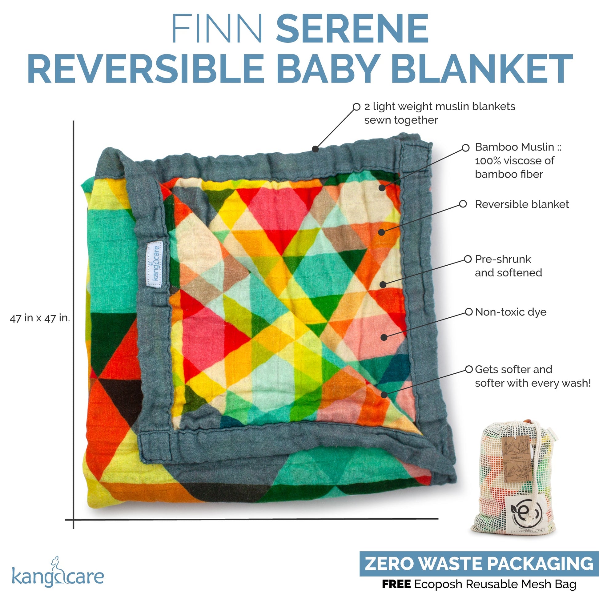 Finn Baby Serene Blankets featuring colorful & bright geometric shapes, making it the life of the party. Soft, lightweight and breathable 100% viscose of bamboo fiber lends itself to becoming the perfect double layer blanket for your sweet baby, toddler, or yourself!
