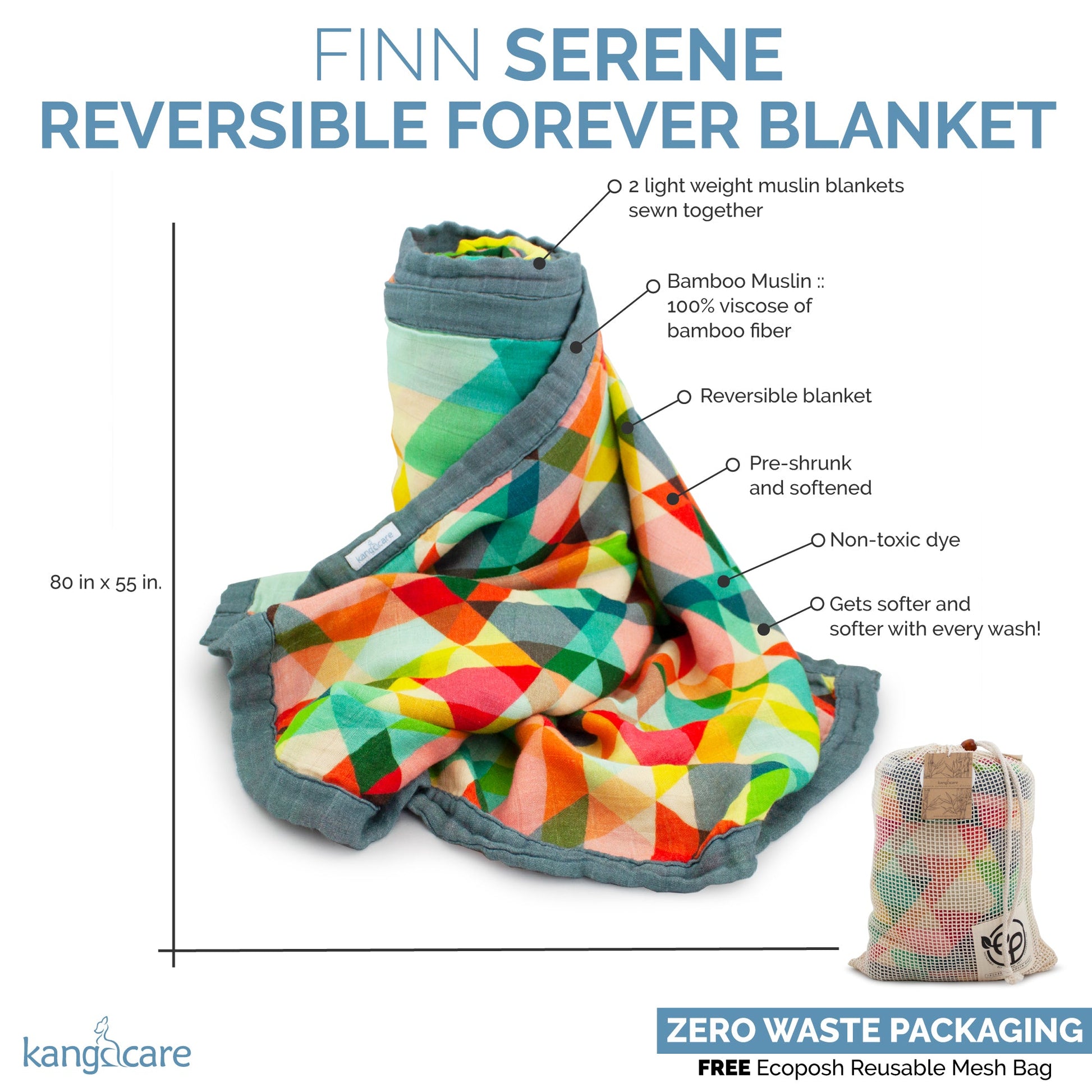 Finn Forever Serene Blankets featuring colorful & bright geometric shapes, making it the life of the party. Soft, lightweight and breathable 100% viscose of bamboo fiber lends itself to becoming the perfect double layer blanket for your sweet baby, toddler, or yourself!
