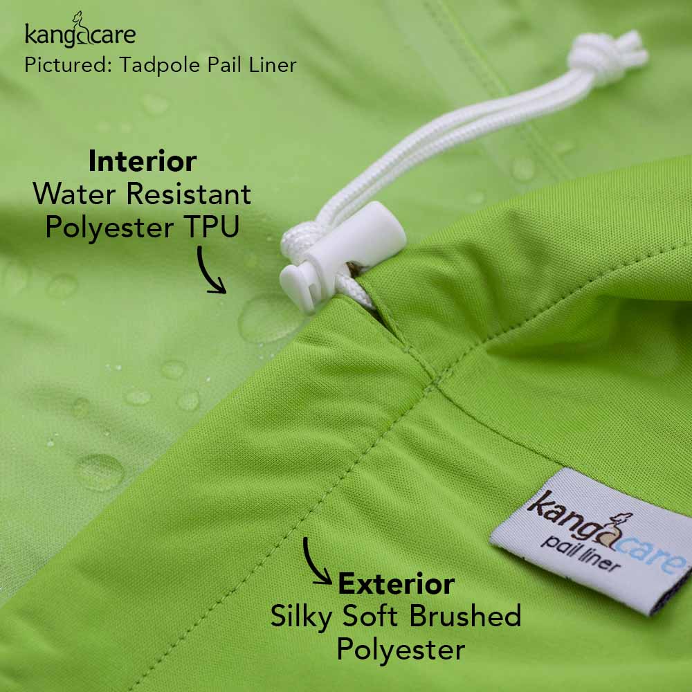 Kanga Care Pail Liners are a cylindrical shape, tapered slightly towards the bottom to allow more volume and fit your pail perfectly! This pail liner keeps the waterproof laminate on the inside where the dirty diapers are. The Kanga Care Pail Liners will fit almost any pail size. To use, place pail liner in a tall kitchen trash can or diaper pail with a closable lid. Cinch the drawstring down with the toggle for a snug and exact fit. The fabric is cuffed at the top of the liner so when you use it in a pail you will see the fun print or color folded over the top! To clean, machine wash with your diapers or other soiled items. Tumble dry low or hang dry. Kanga Care uses a water resistant polyester TPU which is a solvent-free polyester fabric that has been laminated with a thermoplastic polyurethane using a heat bonding process, not chemicals. This process is low in toxicity and is better for the natural environment then traditional PUL.