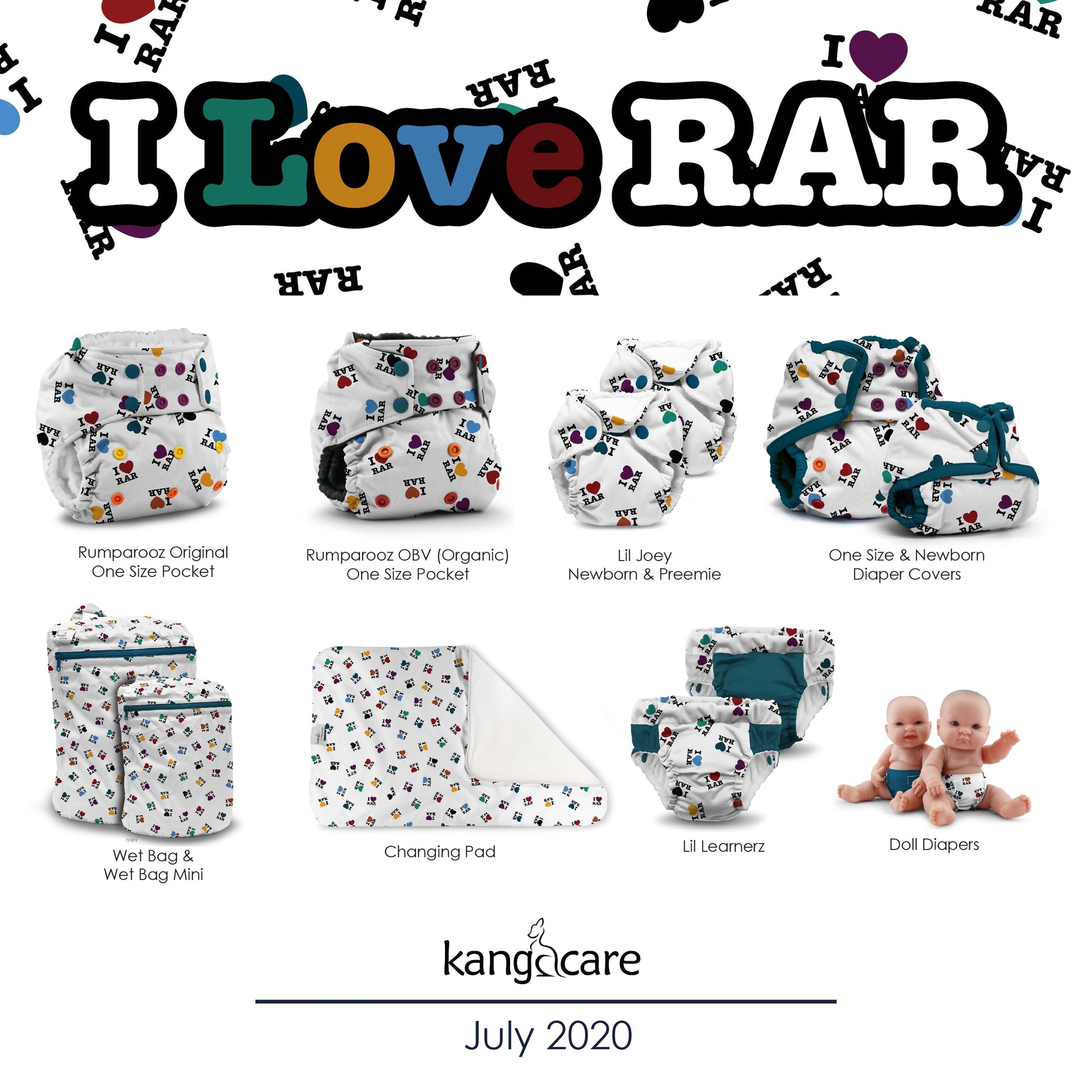 The I Love RAR Wet Bag is for every Kanga Care Fan! Introduced in 2020 this pattern quickly became a must have. Kanga Care Wet Bags are a standard size wet bag, except instead of being flat (like an envelope), they are HALF MOON shaped to allow more volume. This design is EXCLUSIVE to Kanga Care. This wet bag will hold up to 12 to 15 diapers and inserts. The Kanga Care Wet Bags have color matching, heavy duty zippers that are easy to grab. The zipper is placed on the front so the top of the bag functions as a lid. There is a strap on top that can be opened by an industrial strength snap so that the bag can be attached to a stroller handle, door knob, or other ideal hanging place. To clean, machine wash with your diapers or other soiled items. Tumble dry low or hang dry. Visit www.kangacare.com for further information. Kanga Care uses a water resistant polyester TPU which is solvent-free polyester fabric that has been laminated with a thermoplastic polyurethane using a heat bonding process, not chemicals. This process is low in toxicity and is better for the natural environment then traditional PUL.