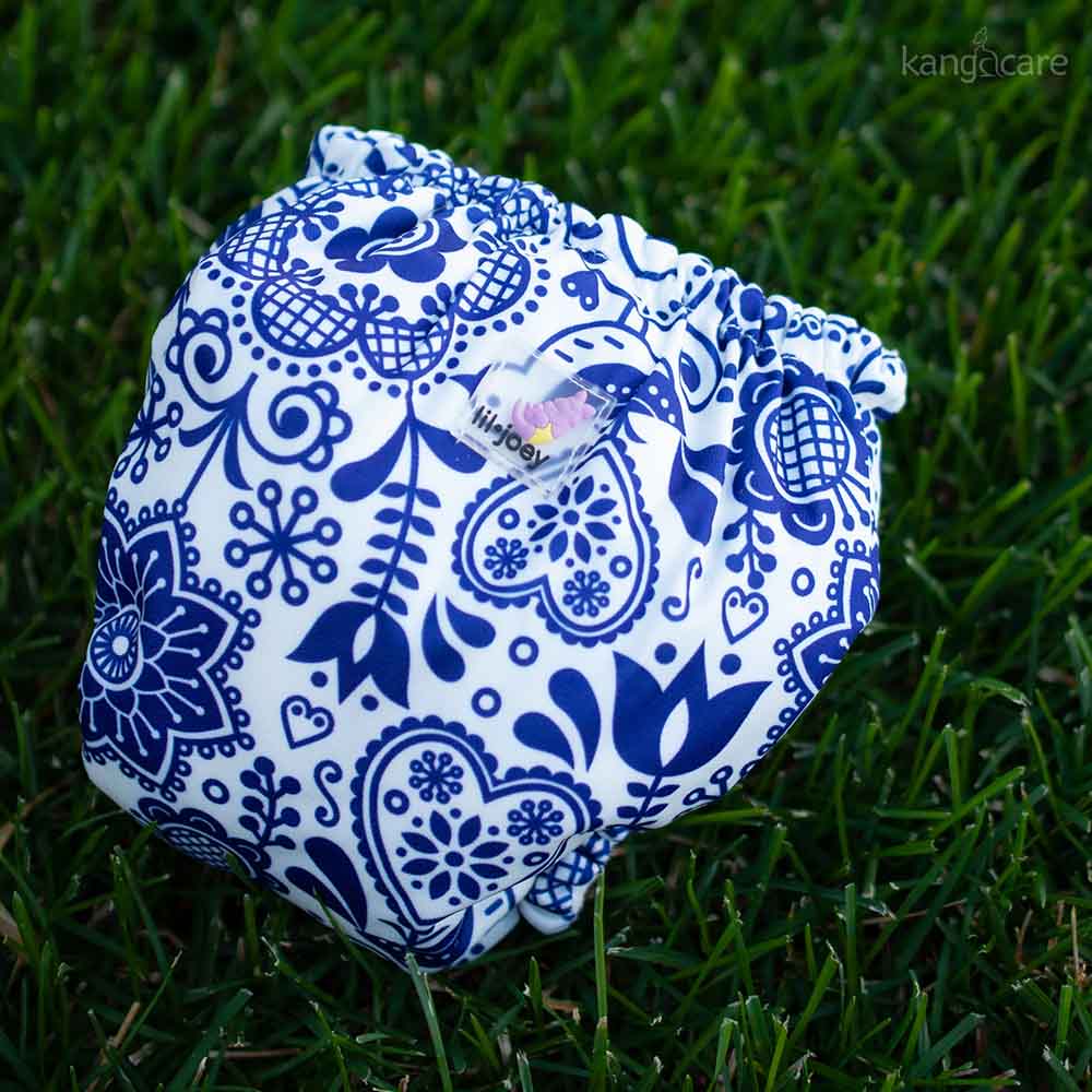 The Lil Joey is a newborn diaper designed to fit from approximately 4-12lbs. Kanga Care brand cloth diapers are the ORIGINAL and ONLY cloth diapers uniquely designed with the patented leak protection technology of dual inner gussets. The inside of each diaper is designed with 2 gentle inner gussets, a double barrier that channels each leg. There is no chance of escape for even the messiest of messes! The Lil Joey takes special care with a snap down front for sensitive cord care during those first precious days.