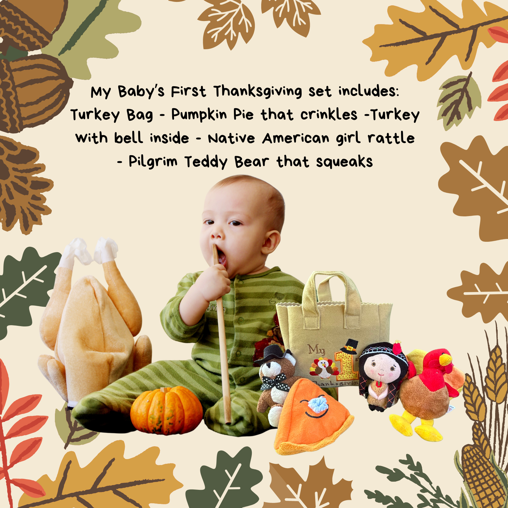 Details: Baby's First Thanksgiving Playset Fill and Spill Toy Keepsake Gift. * Bountiful Fill & Spill fun for baby. * Developmental toys that squeak, crinkle, rattle and jingle. Cute keepsake turkey bag includes crinkly pumpkin pie toy,squeak Pilgrim Teddy bear, Native American girl with rattle and Tom Turkey with jingle sounds. Fun for over the river and to Grandma's house to play! * Baby-safe for ages birth and up.