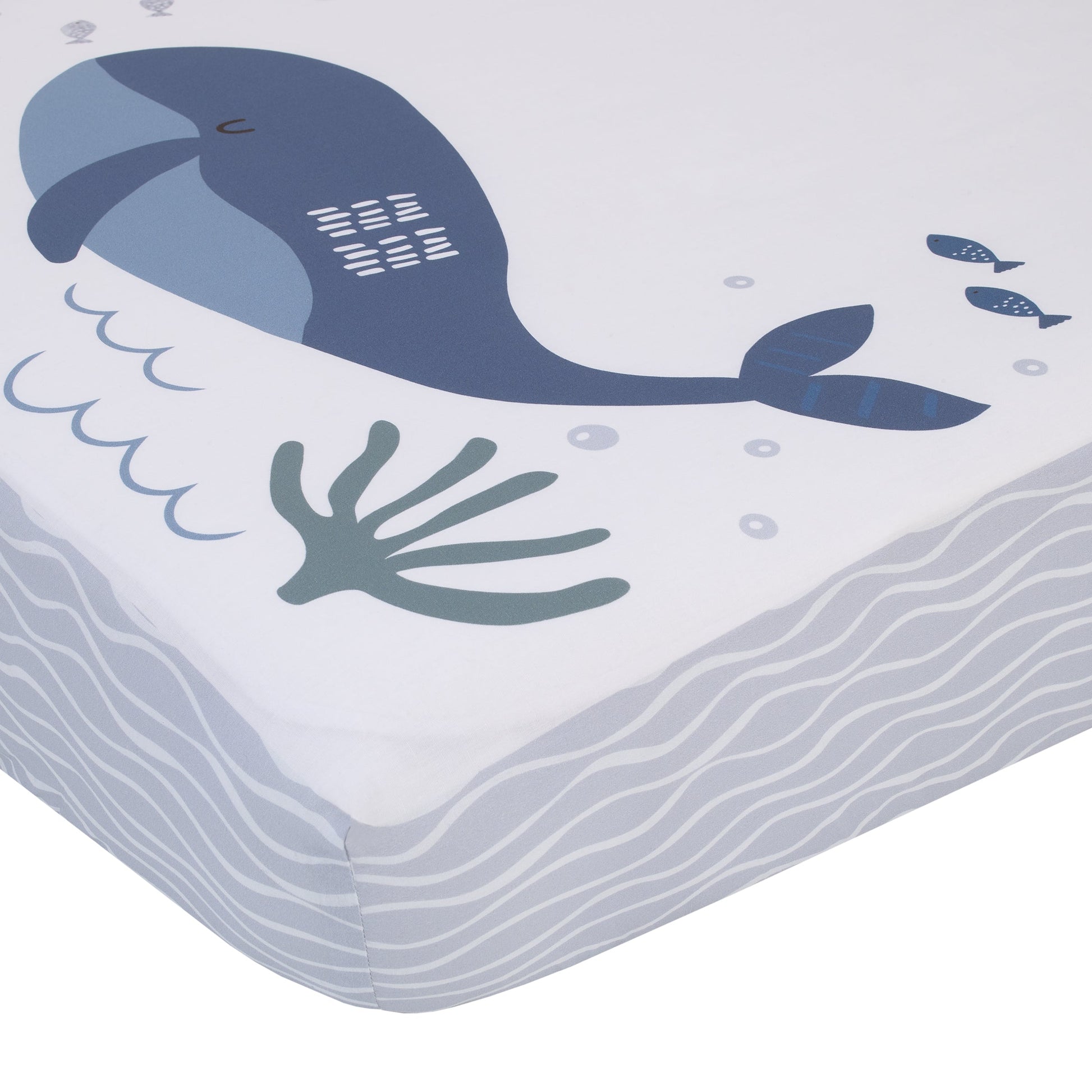 Arctic Adventure Light Blue, White, and Navy Whales, Narwhal, and Walrus "The World is your Oyster" 100% Cotton Photo Op Fitted Crib Sheet