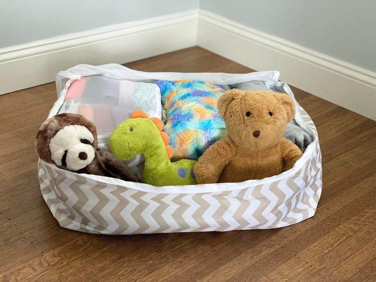 The Large Packing Cube offers a great amount of space for larger clothes, a large collection of cloth diapers, tons of stuffed animals.