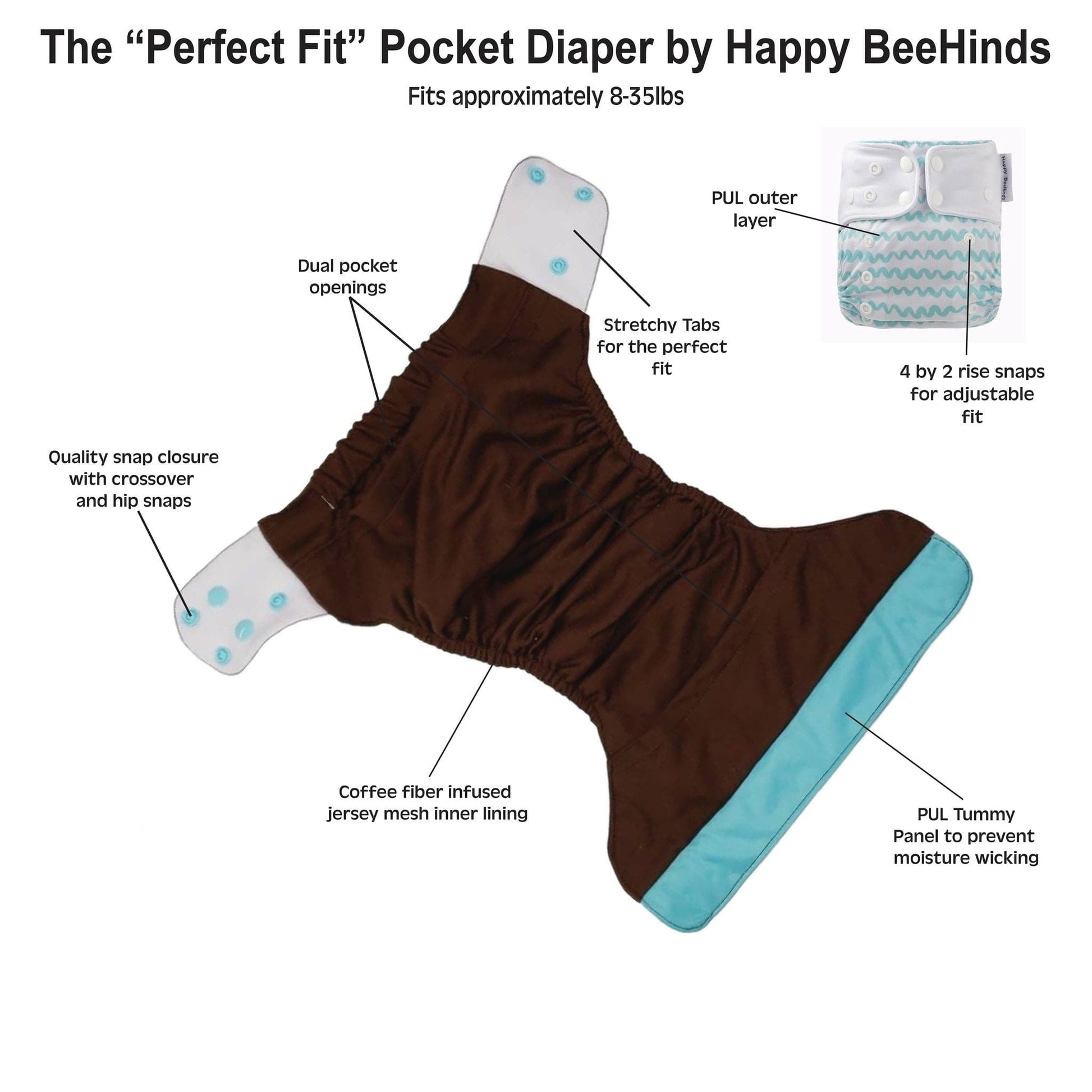 The Happy BeeHinds Perfect Fit Pocket Diaper offers a coffee infused jersey mesh that is cool to the skin and boasts antibacterial properties. Two wide pockets to easily 'stuff' inserts into. A colorful stretchy tab to give you the "perfect" fit with style!