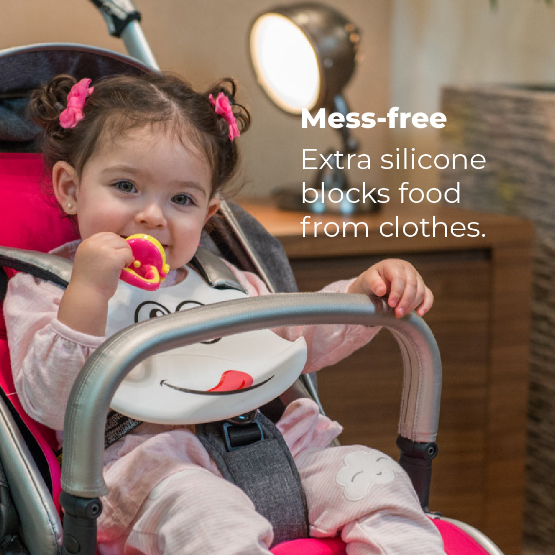 The Primo Passi Silicone Baby Bib White Face, makes mealtime fun and mess free! Made with 100% food grade silicone material, our bibs are soft and light. A variety of colors and fun styles are available for baby boys and baby girls. It's easy to wipe clean and resistant enough to be washed in the dishwasher! Fits most 6+M.