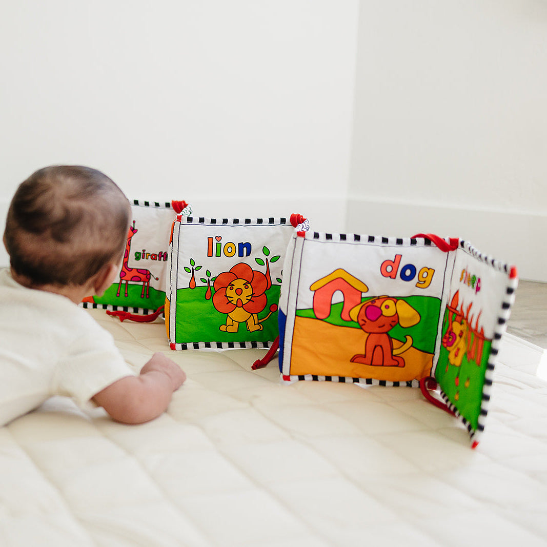 - Utilize this book for tummy time, story time. Play peek-a-boo with it for endless fun. Great for car trips, stroller rides. Use ties to attach book to stroller or car seat.