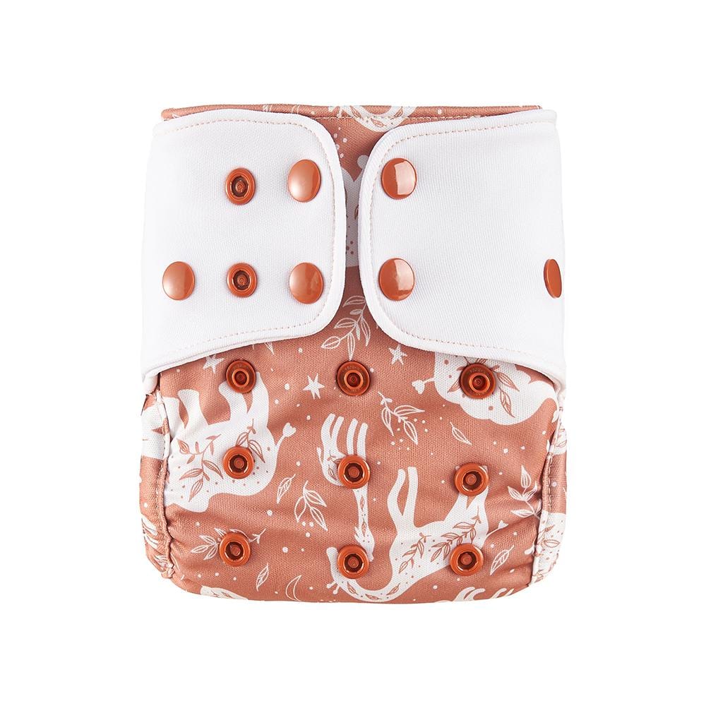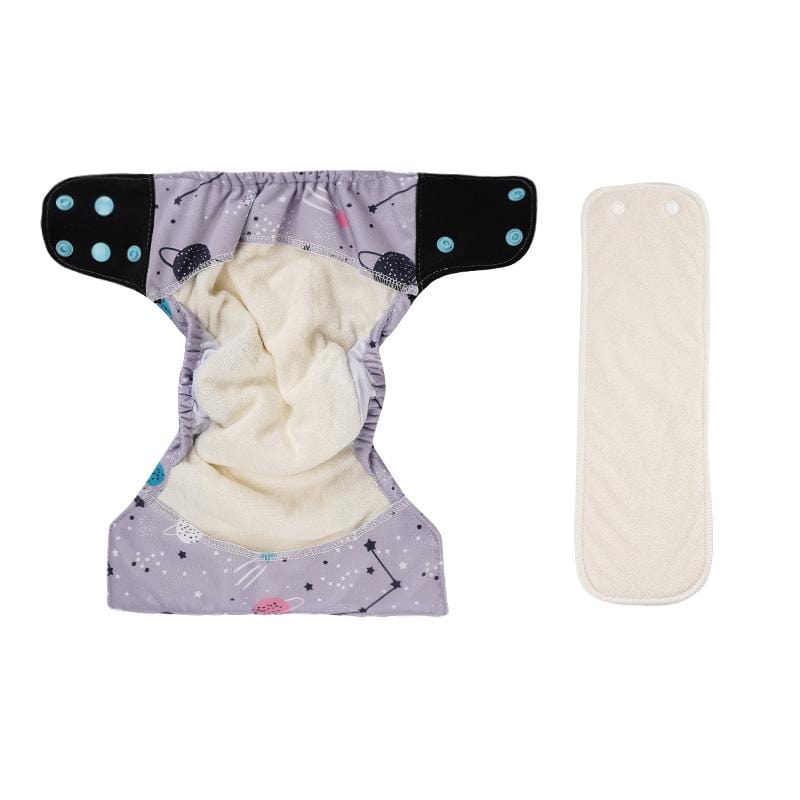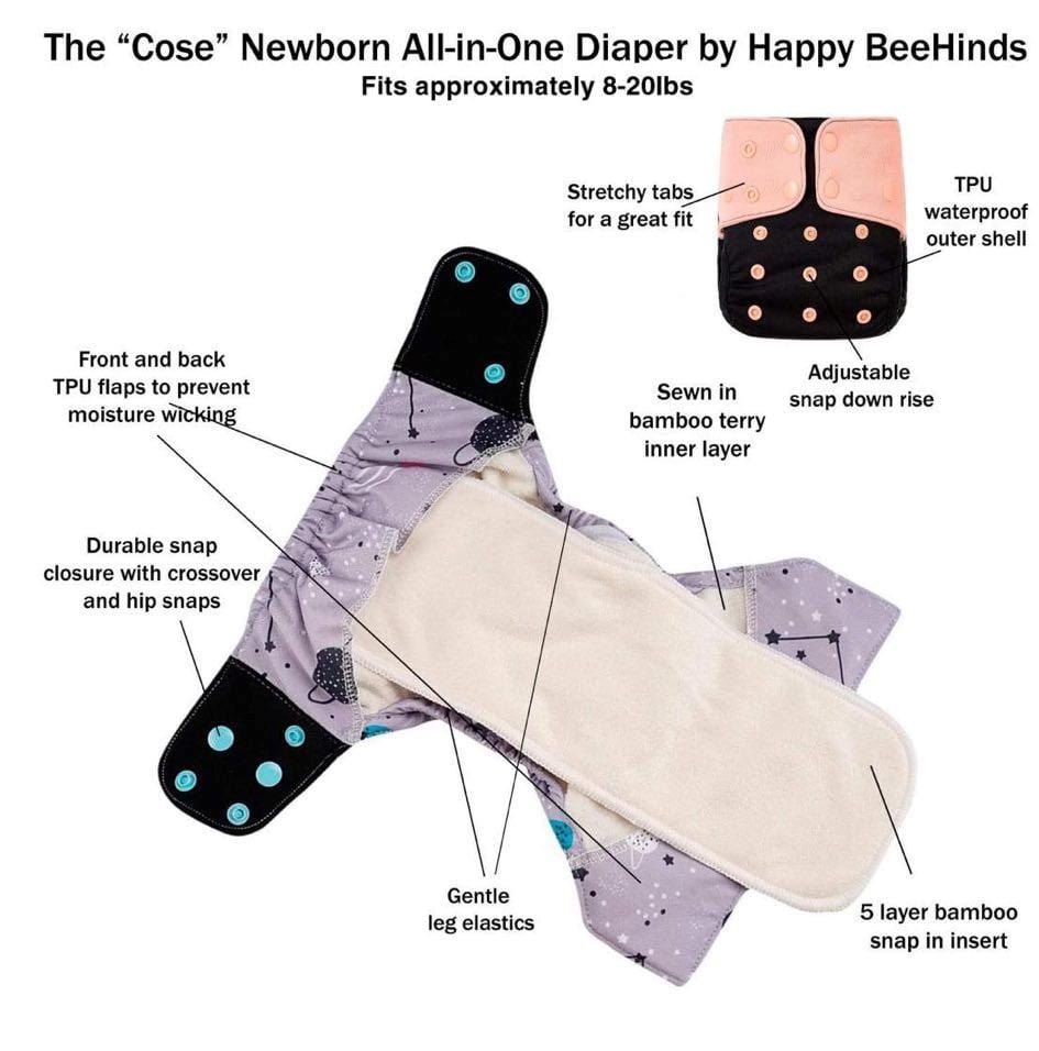 The "Cose" Newborn + All In One Diaper by Happy BeeHinds is highly absorbent with a sewn in soaker and a 5 layer snap in bamboo insert.