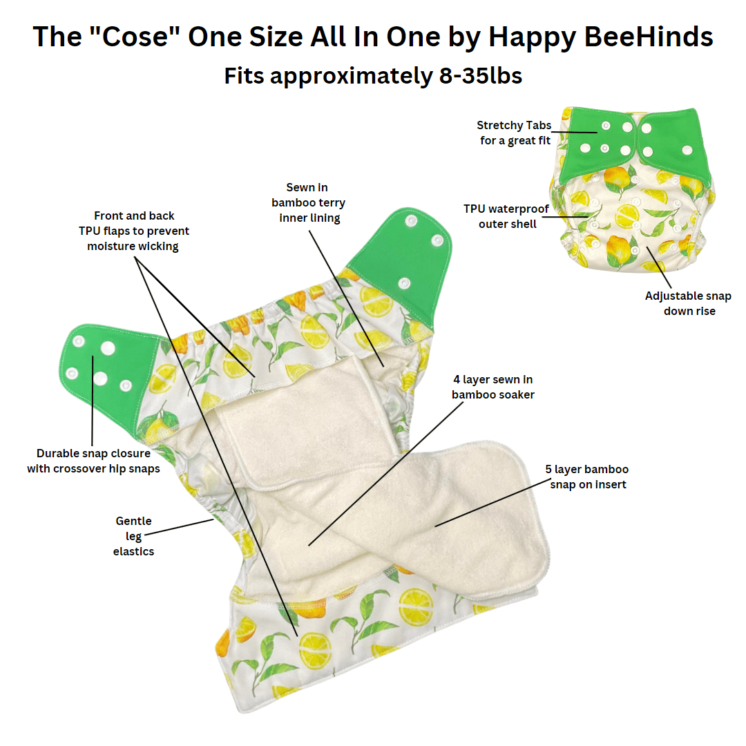 - The "Cose" OS All In One Diaper by Happy BeeHinds is highly absorbent with a 4L sewn in bamboo soaker and a 5 layer snap in bamboo insert.