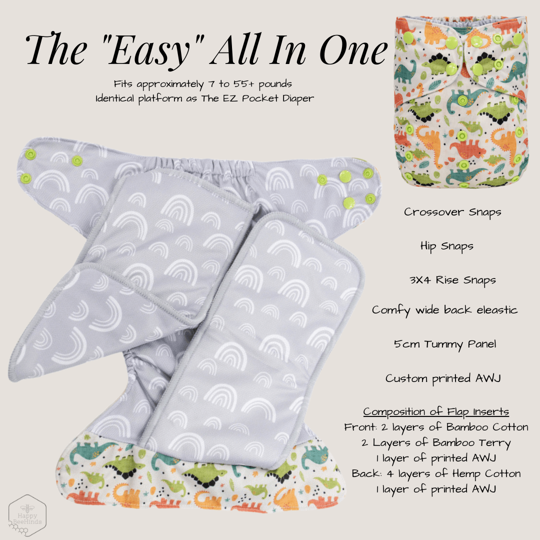 The Easy All In One Diaper by Happy BeeHinds boasts fabulous design features! Accommodates your babe's growth (7-55 lbs.), crossover snaps, hip snaps, and a 3X4 rise choice, so diaper duty's a breeze, cozy, and leak-proof!